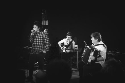 Laura Fédida, transfuge de l’Ecole Nationale Supérieure des Arts de la Marionnette, a essuyé les plâtres : sa saynète de vendeuse-flambeuse d’allumettes au rythme de la chanson Mon Zippo a placé la soirée sous le signe d’une poésie de bric et de broc, gentiment allumée. Willy Will & le Bubble Gang ont ensuite livré une version fanfare-sketch de La Kermesse : aux couplets cascadeurs glissants dévalés à toute allure (et partiellement oubliés ou avalés) par un bateleur foutraque, répondaient les lents refrains tire-larmes chantés par l’une des Sœurs Sisters (Eléna Josse), soufflant le chaud et le froid sur le pauvre Dédé dans sa barbe-à-papa. Enchaînement astucieux et beau contraste : après ce déferlement cuivré, Annick Fitoussi sans musique, sans personne, sans rien, pour une version de Donne-moi de mes nouvelles seule au micro. Jacques Wrez lui a succédé, vibrant a capella sur le premier couplet du Cotentin, avant d’être rejoint par des musiciens au refrain. Il a aussi livré plus tard une interprétation de Mon Abat-jour avec Dominique Cravic, apparemment non-répétée (c’est tout le charme spontané de ces événements) : après un faux départ cahoteux, la sauce a finalement pris et la magie opéré.