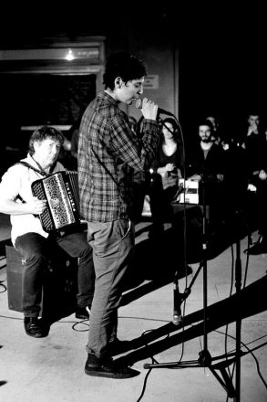 Puis, Mime (Rémi Pablo, Jérémy Dutheil) arrive délicatement sur les premières notes de Je viens vous voir. Le chanteur, beau gosse brun à l’accent délicieux, fraternel la plupart du temps, rocailleux quand il le faut, suscite vite l’adhésion : le public reprend spontanément les habituels « la… la » aux premiers vers de chaque couplet. Sa façon de chanter, très douce et loin du micro, oblige ce qui reste de gueulards (encore au bar) à fermer leur clapet pour saisir l’instant de grâce. Et il se permet même une variante-clin d’œil à la fin : « c’est pour l’amour qu’il v’nait nous voir ». Puis, enchaîne, en toute logique, avec Le Mime, dans une version mixte – sketch d’abord, chanson ensuite, avec le renfort du complice accordéoniss’. Le public ne se formalise pas quand le chanteur plante le dernier couplet, mais l’aide à se rattraper pour réussir sa chute.