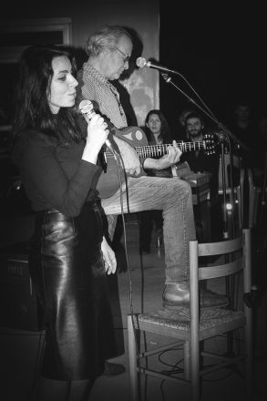 Retour aux complices du Théâtre du Fil, avec Chahinez Hammadi, qui avait joué il y a quelques années dans une mise en scène d’un texte de Novarina par Christian Paccoud : elle interprète cette fois Bilou, chanson apparemment triste dont elle livre une version souriante (toute en pommettes, boucles noires et chemise rouge). Le public s’en mêle, encourage et parsème les trois temps de « hey ! » et « yep yep ! » communicatifs : ça tangue et valse euphorique, la « franginette » a visiblement trouvé du monde pour en découdre avec sa déprime… Lui succèdent Les P’tits enfants de verre : retour en territoire Pierron, version chorale (quelques Sœurs Sisters, Paccoud) – mélodie chaleureuse pour bobos intimes, chaleur humaine contre injustices sociales. Toute la salle se joint au refrain (celui qui ne chante pas, il doit avoir un mot d’excuse de sa mère) : la ritournelle du grand Gérard enfle et s’envole dans les airs, il manque juste un limonaire (avec un vieil air du tonnerre…) pour quitter définitivement la terre.