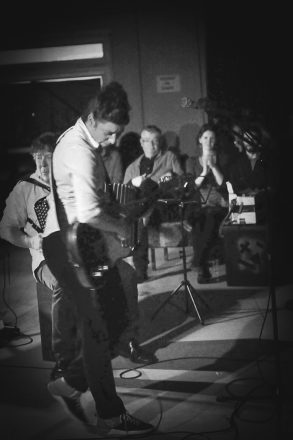 Retour à l’accordéon (Paccoud) pour assurer la transition… Fausse piste : lui succède une guitare électrique nerveuse, un peu funky : Keziah Jones en mode chanson réaliste ? Pas loin… C’est Fab Zoreille et La Gitane, dont les « yeux bleus comme la fumée » prennent des accents blues énervés. Malmenant la mélodie originelle par de brusques ruptures rythmiques, la voix rauque tonitrue avant que la guitare parte subitement en cocottes james-browno-princières quand il est question de « rock-o-flamenco »… avant de ralentir et retomber sur ses pieds. Il double son solo à la bouche, et explique : « Allain Leprest, il aimait ben ce genre de plans… d’ailleurs il a une chanson où il dit : me crois-je encore guitariste ? Etc ». C’est drôle, intempestif, frondeur : comme une nouvelle robe un peu pute à la vieille danseuse des paquets.