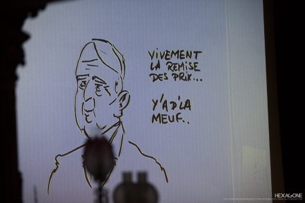 Revenons à la matinée du vendredi 14 avril pour la remise des Coups de cœur de l’académie Charles Cros en chanson francophone pour la deuxième année consécutive au théâtre de Pézenas, dans le cadre du Printival. Les dessinateurs de l’Hélicon (journal quotidien du festival) s’expriment en direct et projettent le résultat sur la scène derrière les chanteurs et le présentateur : de l’humour et de l’impertinence qui font du bien. L’an passé les dessinateurs avaient insisté sur le côté « Muppet show » des membres de l’Academie assis-avachis sur les chaises pendant  la durée de la cérémonie, cette fois-ci l’accent est mis sur les chansons plutôt « plombantes » ou tristes choisies pour cette matinée.