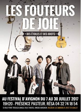 Les fouteurs de joie. Un collectif de chanteurs multi-instrumentistes (Tom Poisson, Nicolas Ducron, Laurent Madiot qui ont chacun leur projet personnel) et deux excellents musiciens. Ayant adoré leurs deux premiers spectacles, vus dans le même lieu à Avignon, je te conseille de découvrir Des étoiles et des idiots, créé l’an dernier au festival, bien rôdé depuis. Les Fouteurs de Joie, burlesques et délirants, ont reçu une ovation debout au festival Aubercail en mai dernier. 19h20, sauf les 11, 18 et 25 à Présence Pasteur – page 357.