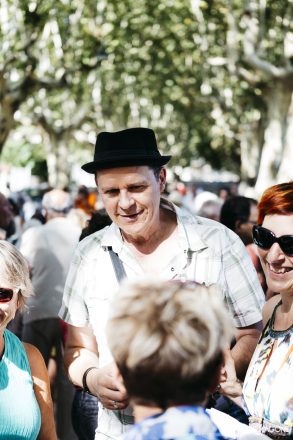 Rencontres ensuite et bien sûr entre passionnés de la chanson. Et ces rencontres créent des liens. Certains retrouvent chaque année des festivaliers, au fil des ans, devenus amis. Ces passionnés sont spectateurs pour le plaisir ou par profession. Rencontres donc aussi de programmateurs de festival ou de salle, d’animateurs d’émission de radio, de journalistes ou/et blogueurs et de photographes. Et rencontres bien sûr entre les artistes et les passionnés. Organisées comme les Rencontres de 11h moins 11, conviviales comme les Apéros-thèmes de Midi-Cèze, ou informelles ces rencontres me paraissent un plus pour un festival et sont certainement une des raisons de fidélisation des festivaliers à Barjac. A noter, pour finir, une nouvelle et belle rencontre avec les mots : L’instant des souffleurs de vers : un texte choisi et enregistré par chaque artiste se produisant dans la cour du château était diffusé avant son concert. Et la totalité de ces textes imprimés a été diffusé dans une enveloppe lors de l’after de la dernière soirée. Une rencontre, comme les autres, à renouveler l’an prochain.
