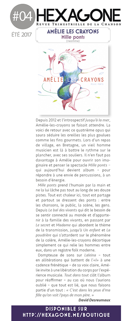 Albums Amélie les crayons – Mille ponts Par David Desreumaux - 9 septembre 2017 0 1875 FacebookTwitter Share this: Click to share on Facebook (Opens in new window) Facebook Click to share on X (Opens in new window) X