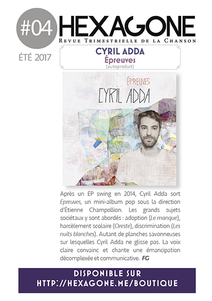 Albums Cyril Adda – Epreuves Par David Desreumaux - 9 septembre 2017 0 2056 FacebookTwitter Share this: Click to share on Facebook (Opens in new window) Facebook Click to share on X (Opens in new window) X