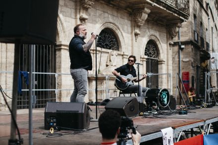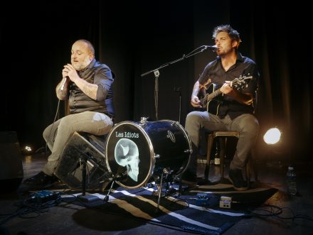 Les Idiots est un groupe relativement récent qui a sorti son premier EP en 2016 Du Gravier et des cordes. Le gravier : la voix éraillée et rocailleuse de Guillaume Boutevillain au chant et aux textes, les cordes : celles de la guitare de Mickaël Garcia aussi aux compositions, parfois à la grosse caisse et au chœur. Ce duo Albigeois, ces derniers temps, a beaucoup été programmé et à raison, dans les festivals du Grand Sud-Ouest : au Printival à Pézenas (34) en avril, à Grain de Sel à Castelsarrasin (82) en mai, ici à Albi (81) en juillet puis à Musicalarue à Luxey (40) et dans plusieurs salles dont le Bijou à Toulouse en juin et en août à Sengouagnet (31) au Bijou de l’été. Ce groupe de scène, propose surtout des chansons réalistes et quelques titres résolument drôles. En chemise sombre et gilet, Guillaume délivre un constat noir et pas idiot, une dénonciation des travers de notre société dans des chansons plus désabusées qu’engagées, rythmées et non dénuées d’humour souvent tranchant.