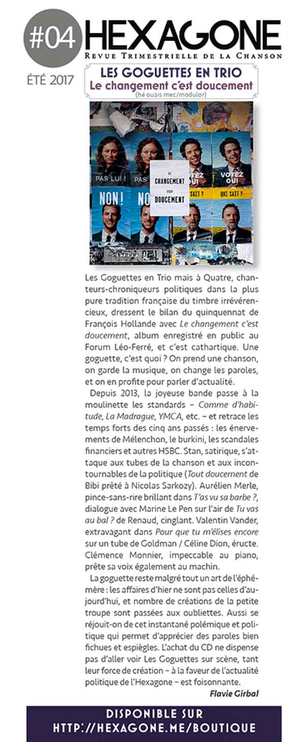 […] de mise en scène. C’est très réussi. » Voici une chronique de concert datant de 2015 et la chronique de leur album en 2017. Nota : le groupe s’appelle Les goguettes en trio, mais à quatre (3 goguettiers et une […]