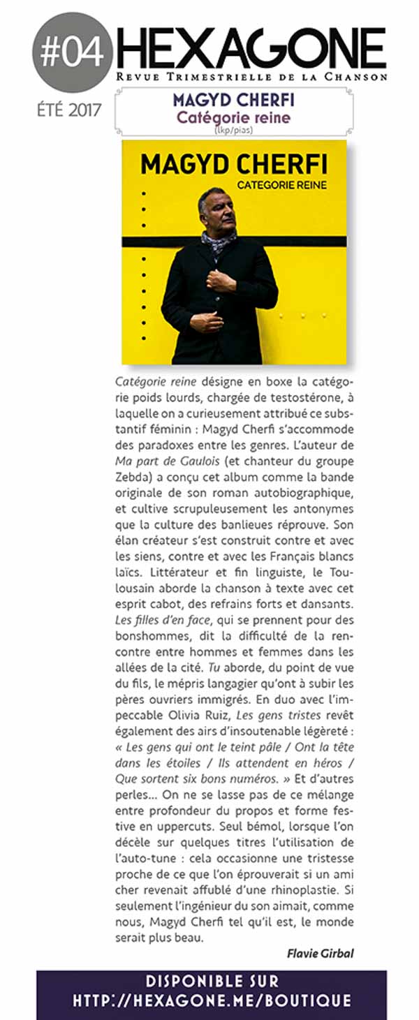 Albums Magyd Cherfi – Catégorie reine Par David Desreumaux - 15 janvier 2018 0 1878 FacebookTwitter Share this: Click to share on Facebook (Opens in new window) Facebook Click to share on X (Opens in new window) X