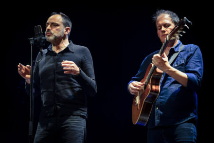 Sur la scène du magnifique théâtre de Pézenas, Presque Oui présente un spectacle particulier : 20 ans, 20 dates. Pour ses vingt ans sous le nom de Presque Oui, Thibaud Defever, retrace son parcours, notamment en chansons, et évoque les différentes périodes. D’abord les débuts du duo où il n’était « que » guitariste et choriste auprès de la chanteuse Marie-Hélène Picard. On entend la voix de celle-ci sur une chanson où justement il continue de l’accompagner à la guitare sur scène et en retrait (un joli moment). De leur premier album, il joue l’incontournable Les perroquets du Périgord, l’original Degâts des eaux et le tendre Le bout du monde. Ensuite, après le décès de Marie-Hélène, Defever continue Presque Oui en solo et en chanteur. Puis Presque Oui devient un duo avec le violoncelliste-flûtiste Sylvain Berthe, et je me souviens d’un superbe spectacle dans ce même théâtre. Et plus récemment Presque Oui a connu un passage en trio. 20 ans, 20 dates se joue en solo, un simple guitare voix, mais avec ce guitariste virtuose, l’accompagnement minimal devient un quasi orchestre et met les oreilles en fête.