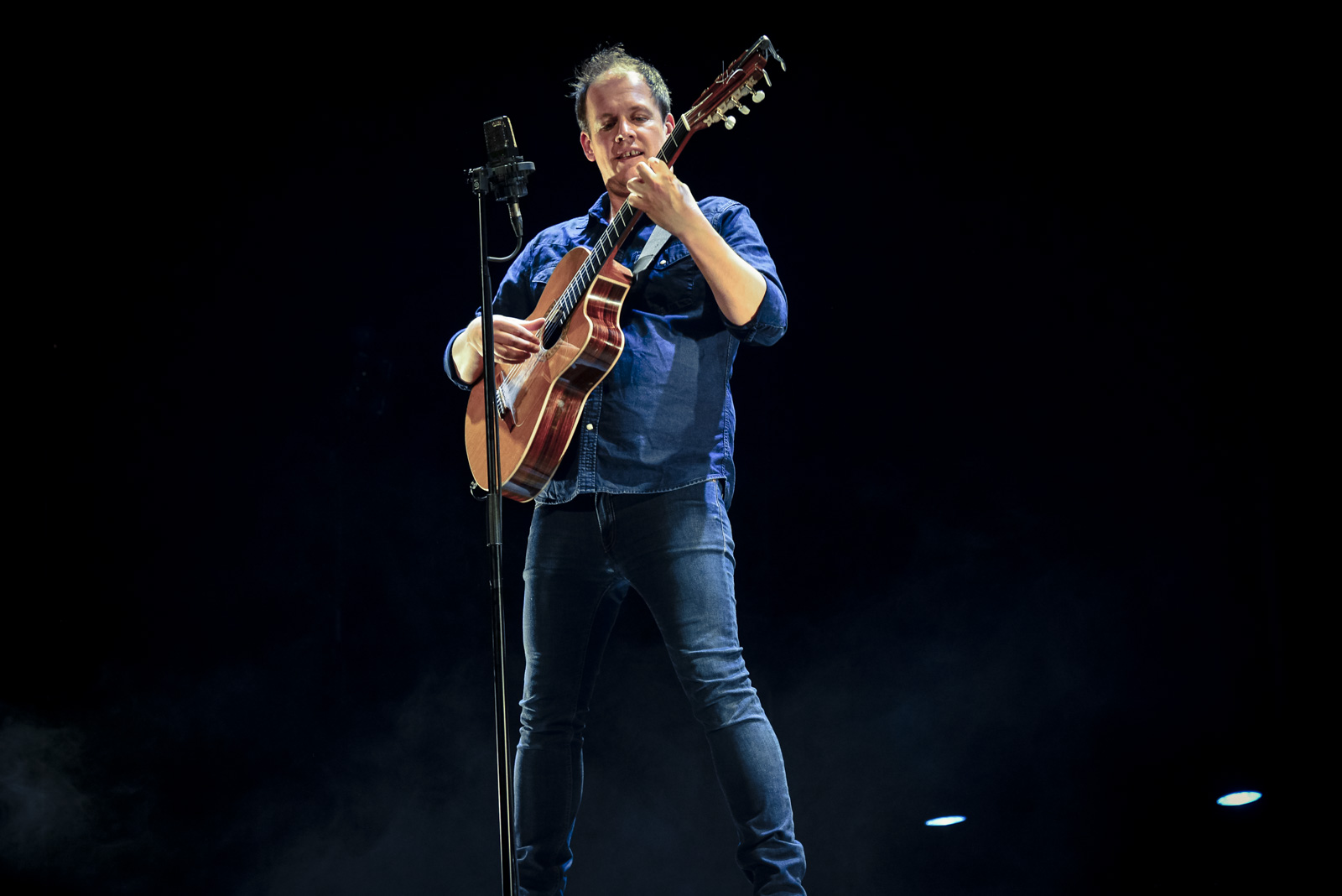 Sur la scène du magnifique théâtre de Pézenas, Presque Oui présente un spectacle particulier : 20 ans, 20 dates. Pour ses vingt ans sous le nom de Presque Oui, Thibaud Defever, retrace son parcours, notamment en chansons, et évoque les différentes périodes. D’abord les débuts du duo où il n’était « que » guitariste et choriste auprès de la chanteuse Marie-Hélène Picard. On entend la voix de celle-ci sur une chanson où justement il continue de l’accompagner à la guitare sur scène et en retrait (un joli moment). De leur premier album, il joue l’incontournable Les perroquets du Périgord, l’original Degâts des eaux et le tendre Le bout du monde. Ensuite, après le décès de Marie-Hélène, Defever continue Presque Oui en solo et en chanteur. Puis Presque Oui devient un duo avec le violoncelliste-flûtiste Sylvain Berthe, et je me souviens d’un superbe spectacle dans ce même théâtre. Et plus récemment Presque Oui a connu un passage en trio. 20 ans, 20 dates se joue en solo, un simple guitare voix, mais avec ce guitariste virtuose, l’accompagnement minimal devient un quasi orchestre et met les oreilles en fête.