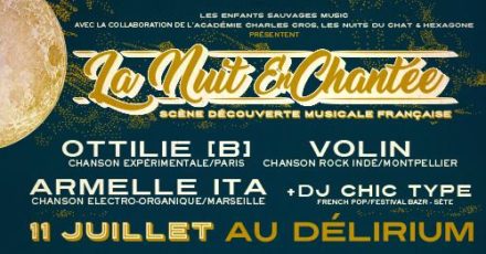 La Nuit EnChantée. A 22h le 11 juillet, au Delirium, une soirée spéciale : une scène découverte musicale française avec Ottilie B (Chanson expérimentale), Volin (Chanson rock indé/Montpellier) et Armelle Ita (Chanson électro-organique/Marseille). Cet événement est organisé par une structure locale « Les enfants sauvages music », avec le soutien de l’académie Charles Cros, Les Nuits du chat et… Hexagone.