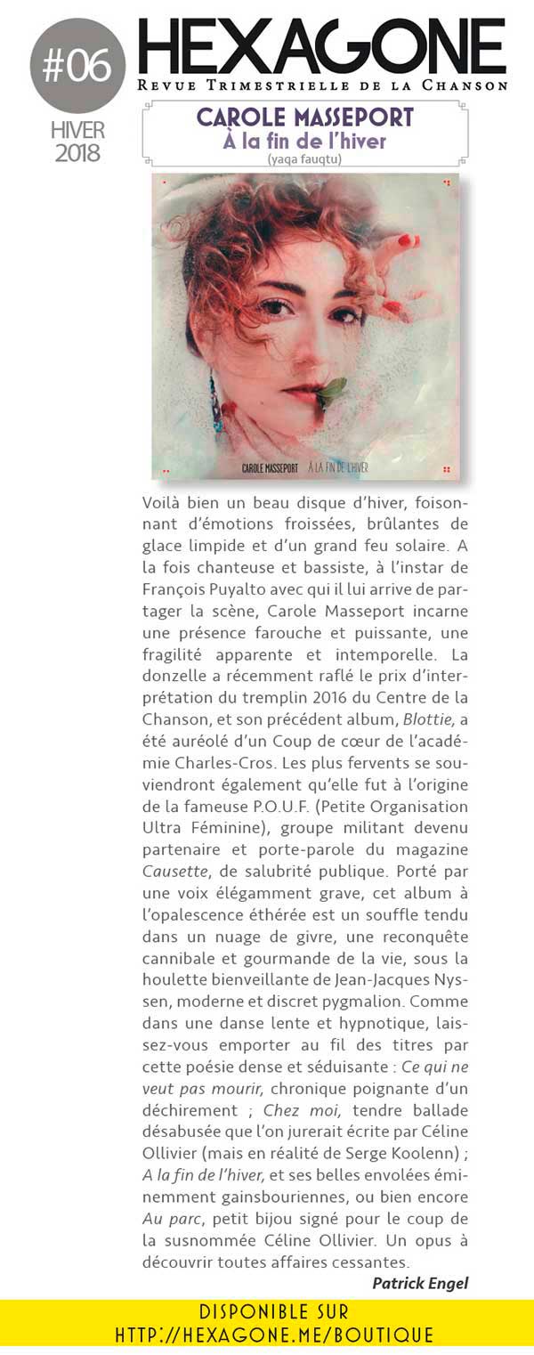 Albums Carole Masseport – A la fin de l’hiver Par David Desreumaux - 19 septembre 2018 0 2029 FacebookTwitter Share this: Click to share on Facebook (Opens in new window) Facebook Click to share on X (Opens in new window) X