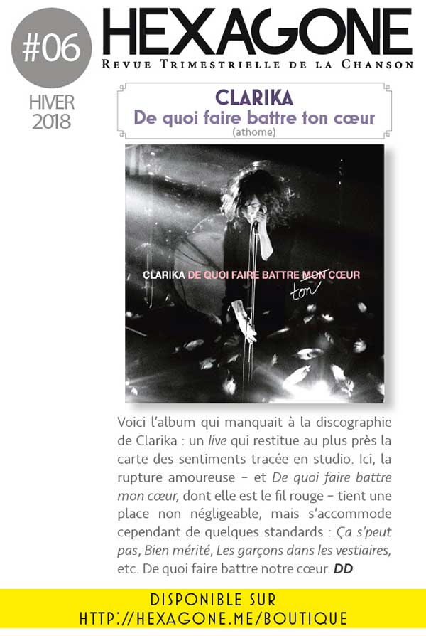 Albums Clarika – De quoi faire battre ton coeur Par David Desreumaux - 19 septembre 2018 0 2036 FacebookTwitter Share this: Click to share on Facebook (Opens in new window) Facebook Click to share on X (Opens in new window) X