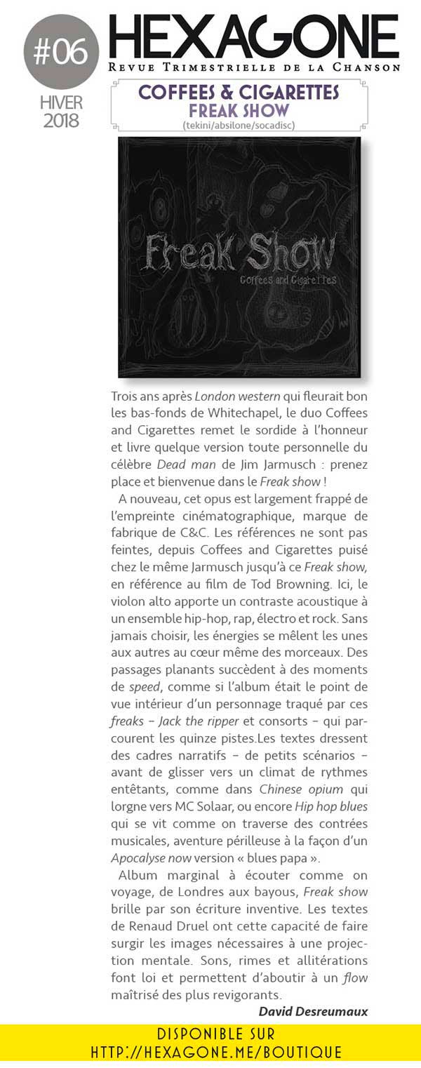Albums Coffees & cigarettes – Freak show Par David Desreumaux - 21 septembre 2018 0 1863 FacebookTwitter Share this: Click to share on Facebook (Opens in new window) Facebook Click to share on X (Opens in new window) X