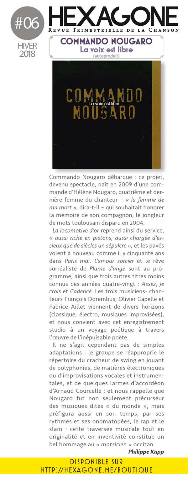 […] Le Relais de poche , en plus de Kilembé déà cité, programme Commando A3 [ Nougaro Tribute ]. Mes notes de concert : « Une belle création originale, une traversée musicale articulée autour de morceaux de Claude Nougaro, un voyage poétique entre chanson, hip hop & musique du monde par les trois interprètes musiciens François Dorembus, Fabrice Aillet et Olivier Capelle. » L’album La voix est libre est chroniqué ici. […]
