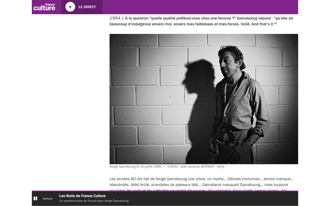 Les Nuits de France Culture ont rediffusé le 25 juillet 2020 un entretien avec Serge Gainsbourg, mené par Jacques Erwan et Marc Legras au cours de l’émission Diagonales diffusée les 16 et 23 octobre 1984.