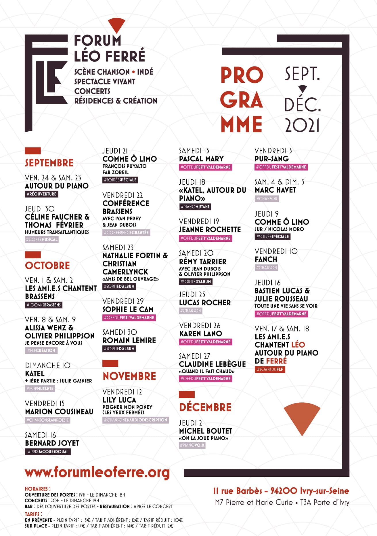 ActuDépêche Forum Léo-Ferré, la programmation de septembre à décembre Par David Desreumaux - 3 septembre 2021 0 2705 FacebookTwitter C’est avec grand plaisir que nous voyons enfin le Forum Léo-Ferré, à Ivry-sur-Seine, rouvrir ses portes pour cette nouvelle saison. Voici la programmation du premier trimestre. Ça démarre à la fin du mois, restez prêts ! Share this: Click to share on Facebook (Opens in new window) Facebook Click to share on X (Opens in new window) X