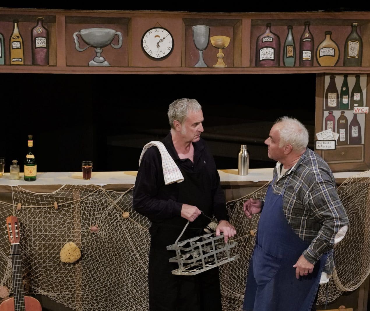 Dans la forme, ce spectacle théâtral, semble volontairement assez éloigné d’un concert d’Entre 2 Caisses. Jean-Michel Mouron qui était le seul sans instrument, joue de la guitare, et Bruno Martins a délaissé sa contrebasse pour un accordéon. Ils chantent moins (une dizaine de titres) et pas vraiment le même répertoire : Niagara (L’amour à la plage), la Rue Ketanou (Le capitaine la barrique) et Fernandel : La bouillabaisse pour laquelle ils font entonner au public le refrain : « Ah que c’est bon la bouillabaisse, ah mon dieu que c’est bon, bon, bon » Sur les sujets abordés, ce spectacle apparaît très proche de ces deux artistes. Les histoires et souvenirs sont parfois inventés (comme les aventures de Borgnefesse), souvent autobiographiques (comme les voyages au Portugal ou en Irlande). On ressent la grande et longue complicité, ainsi que la tendresse et la nostalgie qui unit ces deux amis (excellents comédiens qui ont su transférer tout cela sur leurs deux personnages !). Le groupe Entre 2 Caisses s’était formé pour partager des chants de marins et pour le rappel ce sera… une chanson de marin (Les filles de Lorient). Toutes les histoires et les chansons respirent la mer. Nous avons été particulièrement émus par Bréhal chanté a cappella par Jean-Michel et nous avons fortement apprécié leur interprétation pour Les Marins (Font et Val) et Verne et Zola (Bernard Joyet). Ces deux amis, amateurs de vin, finissent par Fortis, j’aimais le vin (Gérard Pierron) : « Auront-ils le goût que je garde / Et la saveur de l’amitié ? / Vin rouge, anis, rhum et café »