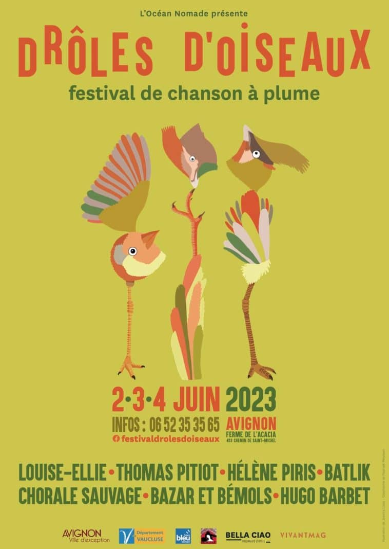 Le festival chanson Drôles d’Oiseaux, concocté par Thomas Pitiot avec son équipe de bénévoles, déploie à nouveau ses ailes du vendredi 2 au dimanche 4 juin pour une troisième édition estivale. Un joli rendez-vous chansonesque et fraternel, avant la grande foire de juillet, qui se déroule en ceinture verte d’Avignon dans un cadre idyllique à la ferme de l’Acacia et ses paysans bio.