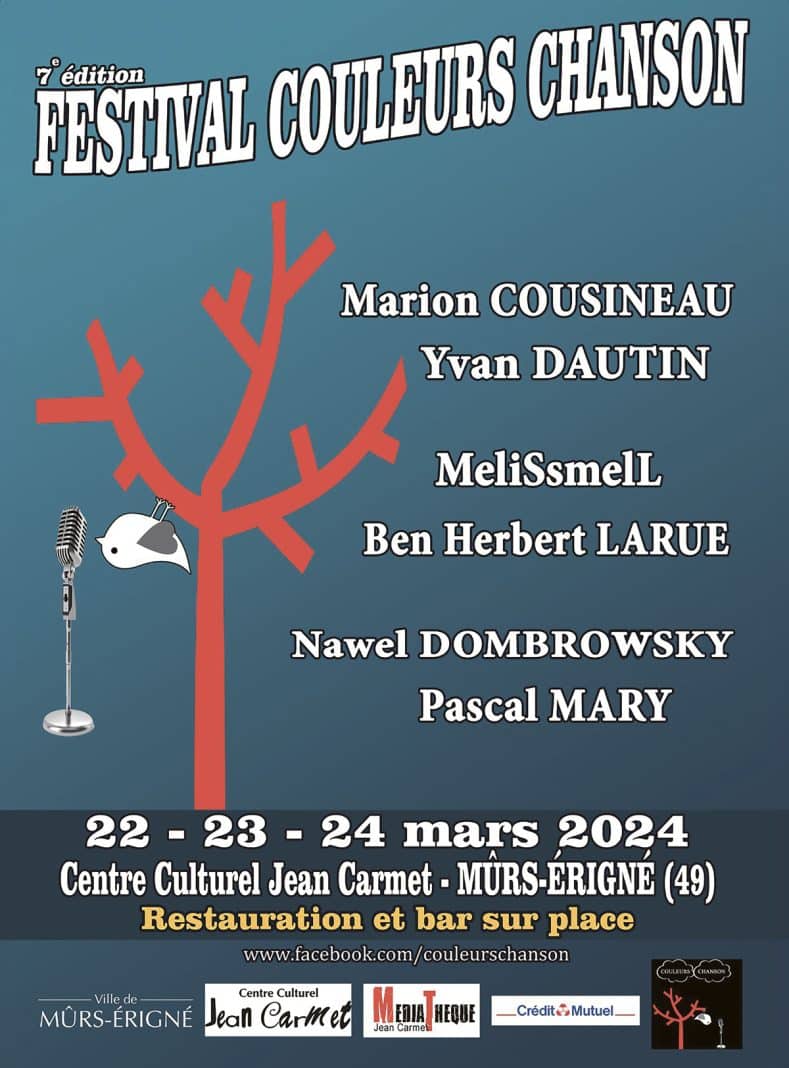 Les 22, 23 et 24 mars 2024, le Centre Culturel Jean-Carmet de Mûrs-Érigné (49) accueillera la septième édition du festival Couleurs Chanson, organisé par l’association Couleurs Chanson qui a pour objet de « promouvoir la chanson francophone par le biais de manifestations diverses (spectacles, festivals, expositions, soirées à thème), en privilégiant des collaborations avec les acteurs de la vie culturelle locale. Elle est au service d’une chanson exigeante, ouverte et populaire, issue du patrimoine ou du répertoire contemporain, qui porte des valeurs poétiques et humanistes. »